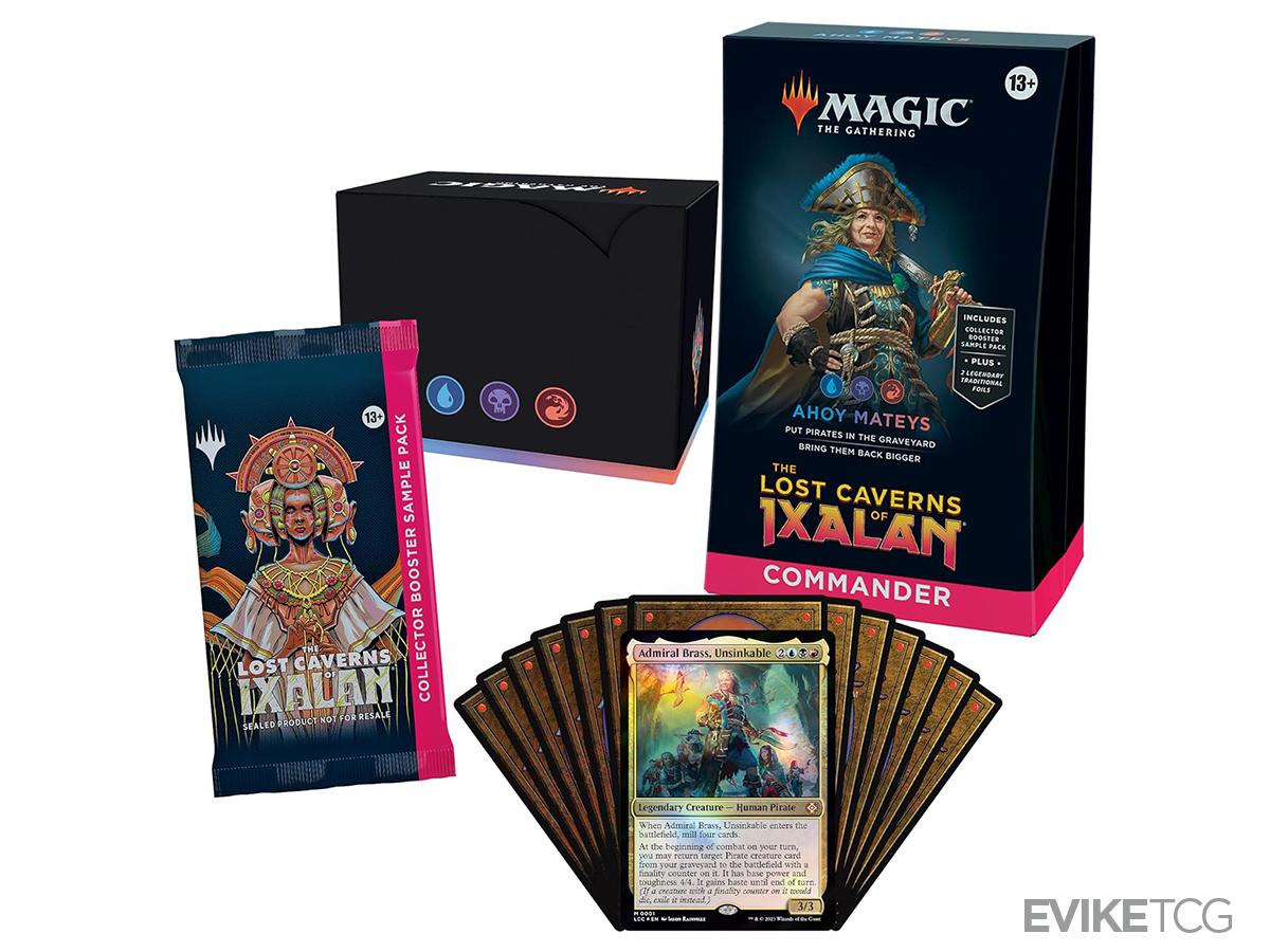 Package Includes: 1 ready-to-play Ahoy Mateys The Lost Caverns of Ixalan Commander Deck (includes 2 Foil Legendary cards), a 2-card Collector Booster Sample Pack, 1 Foil-Etched Display Commander, 10 double-sided tokens, 1 life tracker, and 1 deck box