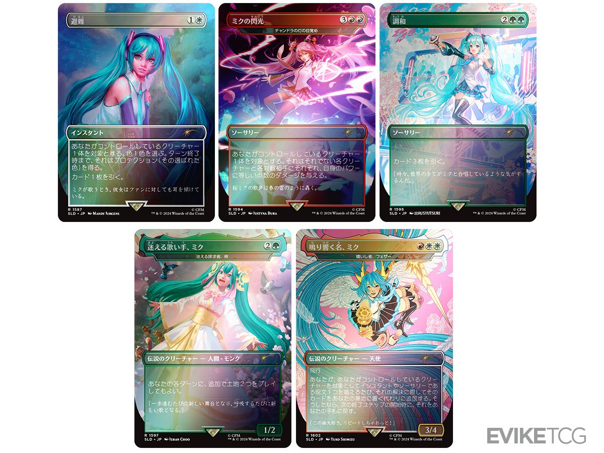 - Contents include (Rainbow Foil Borderless): Shelter (foil), Chandra's Ignition as "Miku's Spark" (foil), Harmonize (foil), Lost but Seeking as "Miku, Lost but Singing" (foil azusa), the Redeemed as "Miku, the Renowned" (foil feather), Inspiring Vantage (foil)