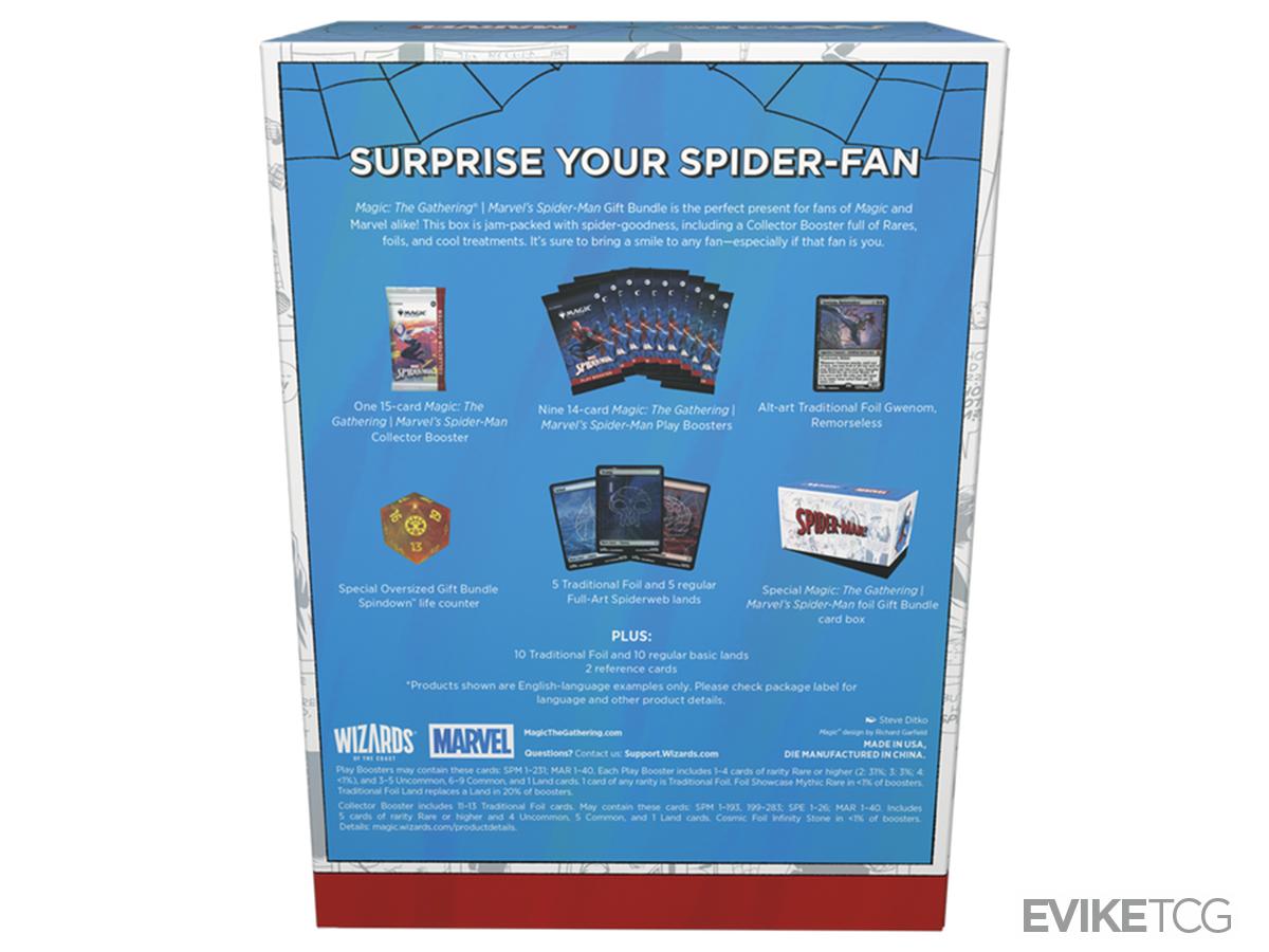 This Magic: The Gathering "Marvel's Spider-Man" Gift Bundle is the perfect present for fans of Magic and Marvel alike! Jam-packed with spider-goodness, it's sure to bring a smile to any fan - especially if that fan is you. This Bundle contains 9 Magic: The Gathering | Marvel's Spider-Man Play Boosters (each containing 14 cards), 1 Collector Booster, 1 Traditional Foil alternate-art promo card, 15 Traditional Foil Basic Land cards (including 5 with Full Art), 15 nonfoil Basic Land cards (5 with Full Art), 1 oversized Spindown life counter, 1 foil card storage box, and 2 reference cards.